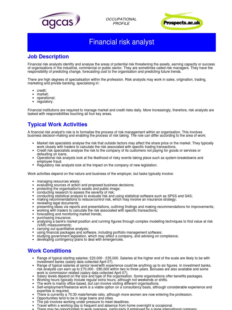 Risk analysts are responsible for identifying and analyzing areas of potential risk that threaten the assets base, earning capacity, and general financial success of the private or public sector organizations that employ them or contract their services. They typically work for banks and insurance companies, though any company handling large amounts of money may choose to hire a risk analyst. Financial risk analyst • job description, salary & benefits financial risk analysts are employed by companies to identify and scrutinise possible risks that will have an impact on the financial success of their business. They are not intended to be construed as an exhaustive list of all responsibilities, duties, and skills required of employees assigned to this job. The senior financial analyst work description entails continually identifying ways to improve processes and levels of efficiency, and also carrying out oversight surrounding tools and databases in the preparation of weekly analysis and communication of performance, risks, and opportunities to management.